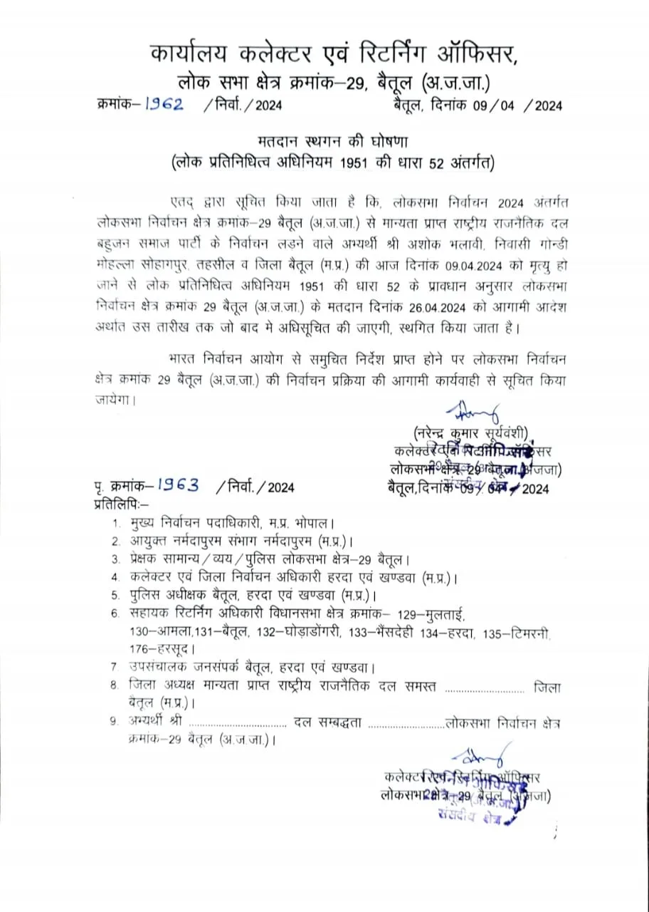 Betul News: बैतूल संसदीय क्षेत्र का लोकसभा चुनाव स्थगित